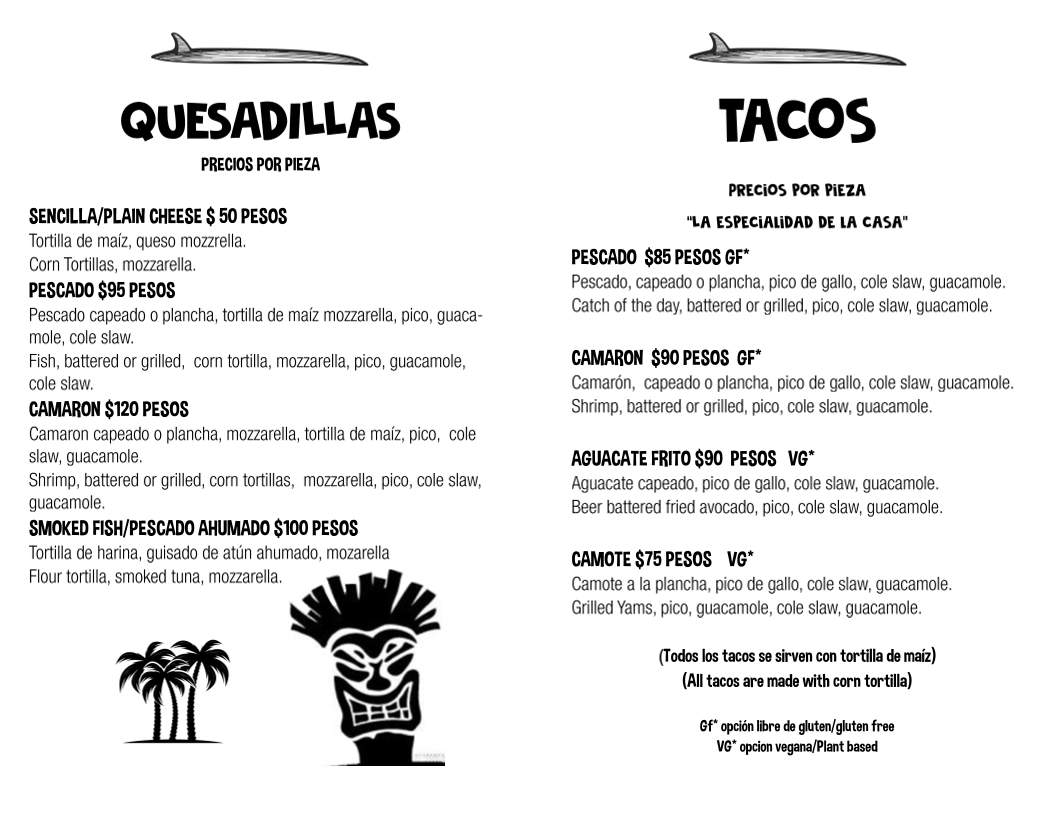 Pescado capeado o a la plancha, tortilla de maiz, mozarella, pico de gallo, guacamole, repollo con zanahoria / Fish, battered or grilled, corn tortilla, mozarella, pico de gallo, cole slaw, guacamole.